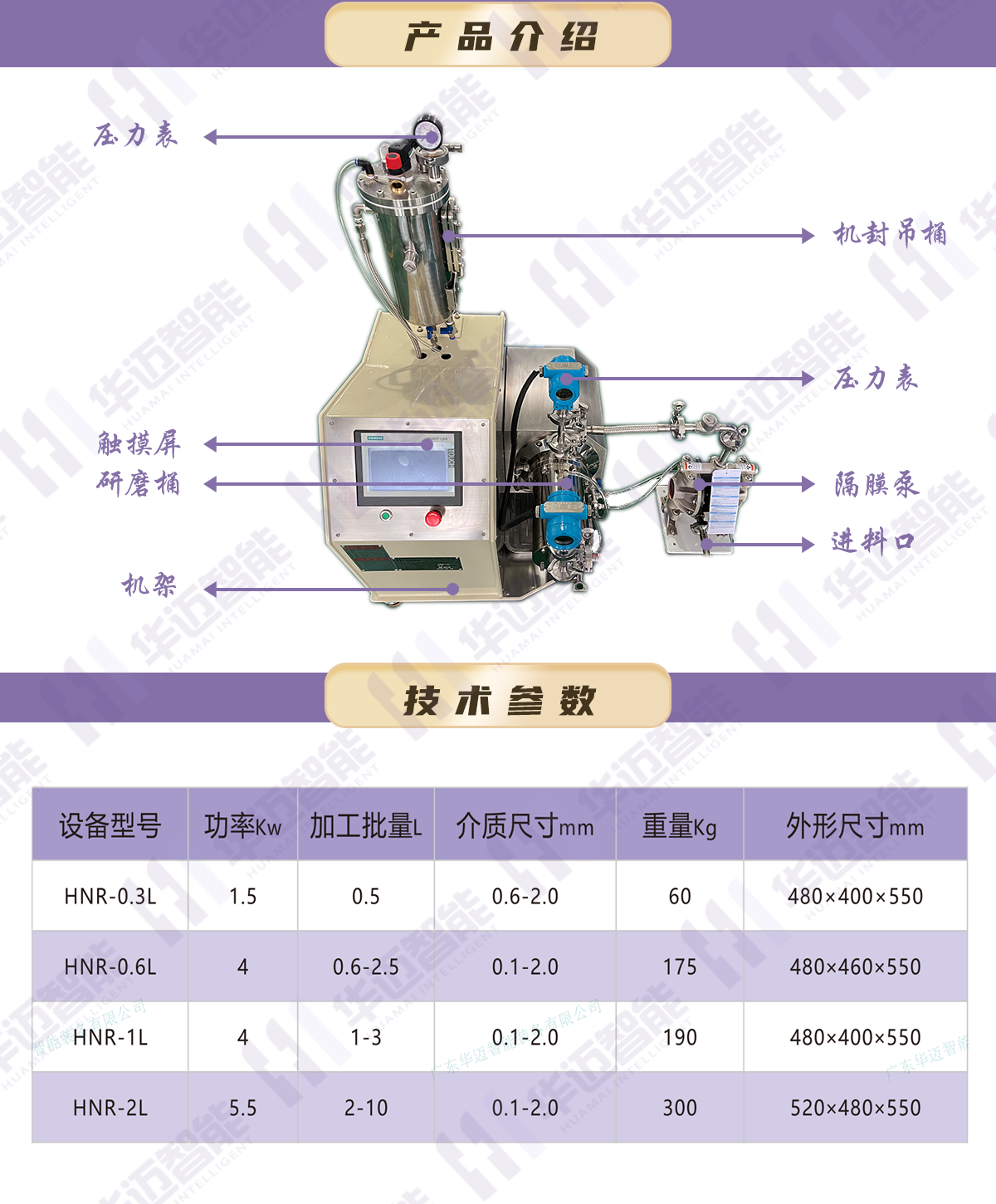 华迈智能HNR系列实验型纳米棒销式砂磨机,可同比放大产能,具备将材料研磨至100nm-2um的能力,适用于高等院校、科研单位、企业实验室等配方验证和学术研究。